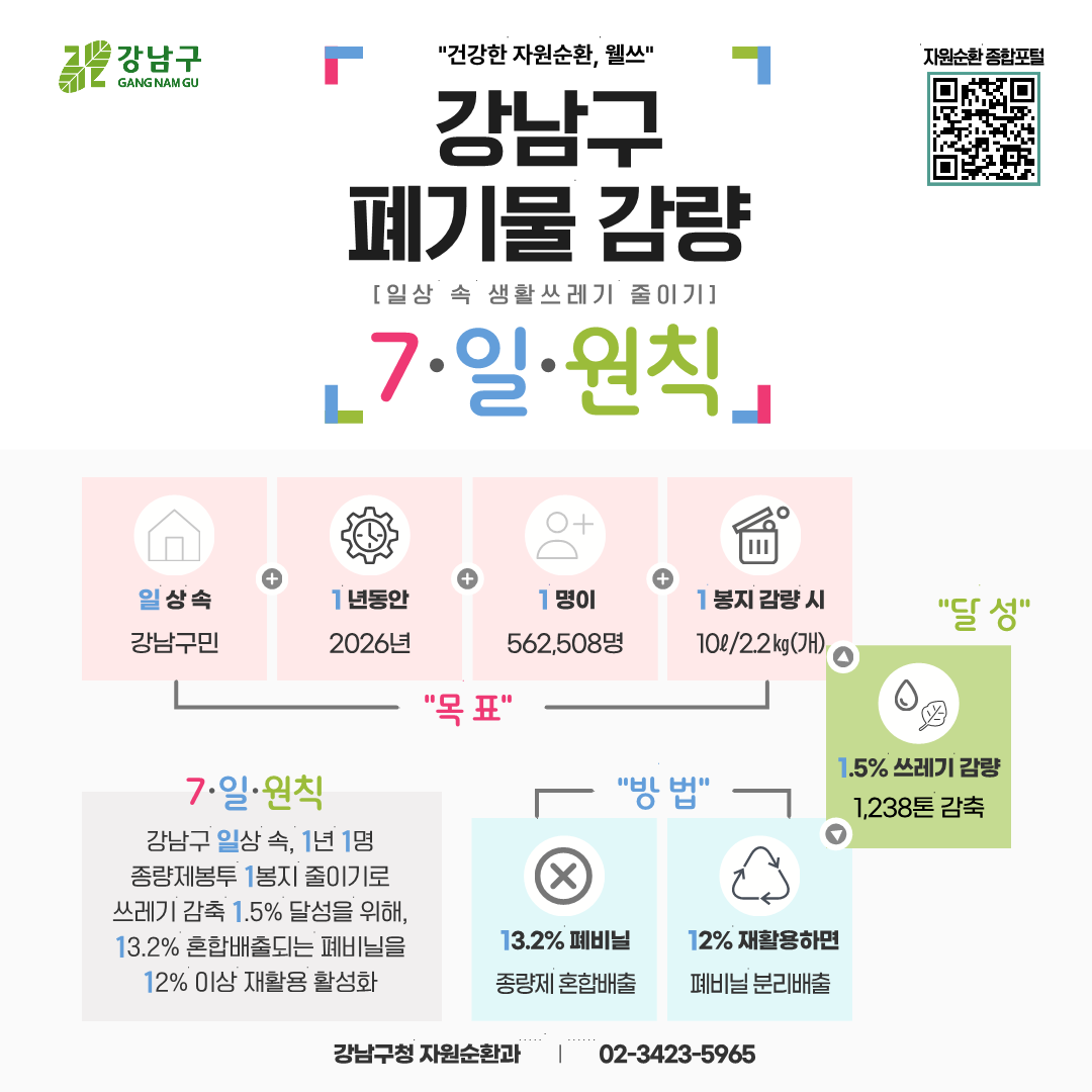 내가 줄인 쓰레기 봉투 한 개가 가벼운 서울을 만듭니다! 강남구에서는 폐기물 감량을 위한 일상 속 생활쓰레기 줄이기 운동을 실시합니다. 지속 가능한 미래를 위해 강남구 '7·일·원칙'에 따라 오늘부터 일상 속 종량제 봉투 한 봉지 줄이기를 함께 시작해봐요!🌿 ![]()